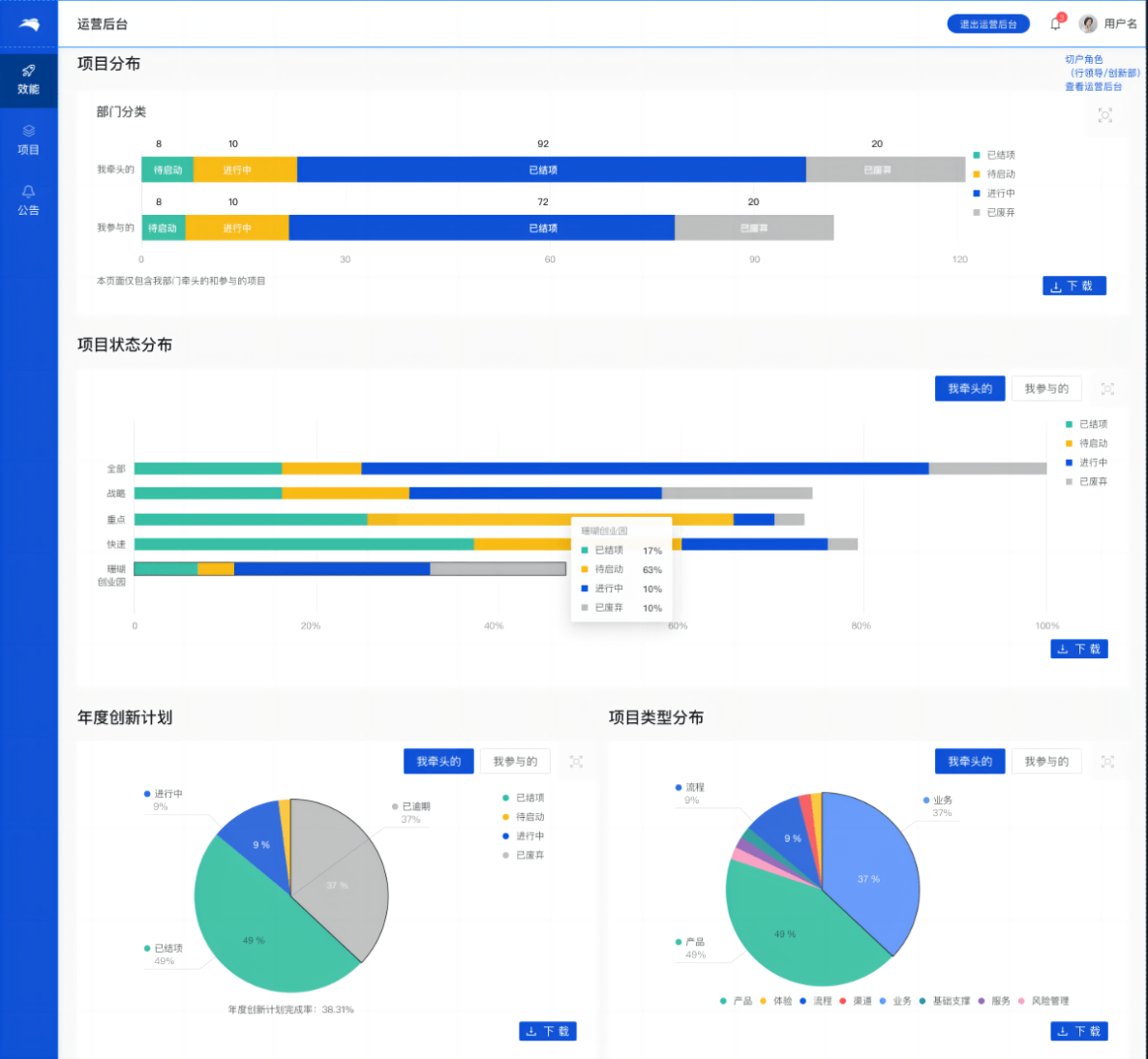 项目责任部门可直接通过项目运营模块直接观察到项目的分部情况、状态情况、以及与责任人直接相关联的项目分部情况;