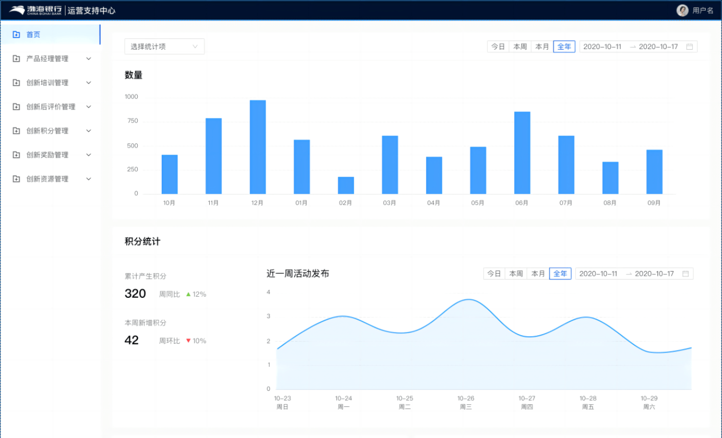 此系统模块对项目运营需要的各项数据进行管理及可视化呈现,数据统计指标可切换为产品经理、培训、项后评价、积分、奖励、资源,其他功能模块为【创新成果管理】功能集成。在收集数据并处理呈现后,使创新结果数据更加简单明了,管理者在了解运营数据的同时也可以轻松简单的实施奖励机制。