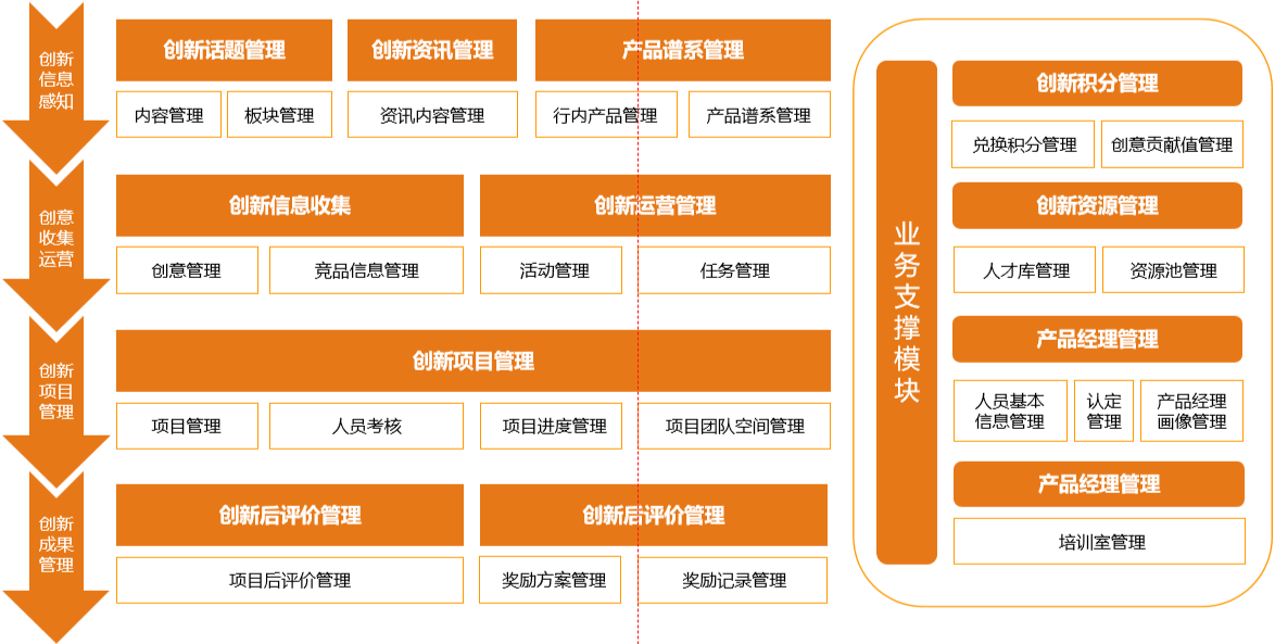 产品与业务创新平台主要涉及的业务有:创新话题的讨论、创新资讯的发布、个人创意的收集、创新事项的发布、产品目录的管理、产品的全生命周期管理、创新项目的全生命周期管理、创新奖项、资源、培训的管理、行内产品经理的管理。